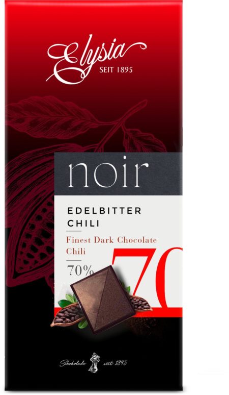 In der dunklen Schokolade Elysia Noir 70% spiegelt sich unsere innige Liebesbeziehung zur Kakaobohne wider. Manchmal ist mehr eben mehr. Die getrockneten Chilischoten verleihen dieser charaktervollen, herben Bitterschokolade eine exotisch feurige Note.