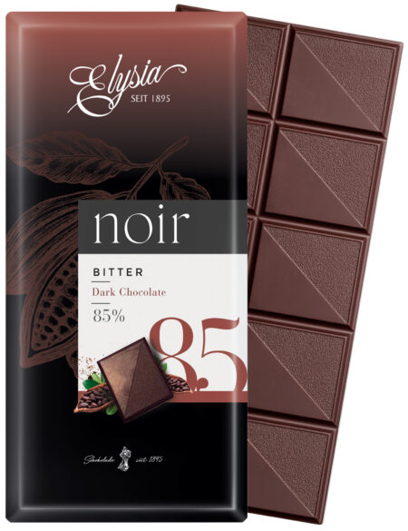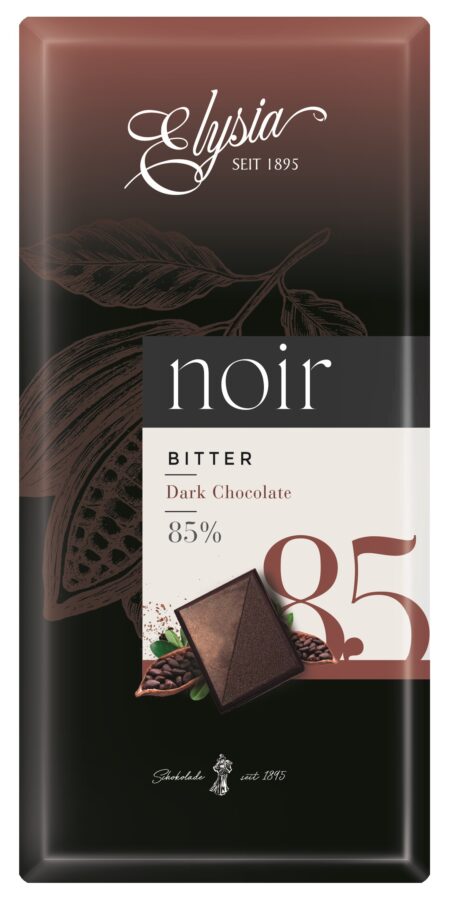 In der hochprozentigen Bitterschokolade Elysia Noir 85% spiegelt sich unsere innige Liebesbeziehung zur Kakaobohne wider. Manchmal ist mehr eben mehr. Bereits beim ersten Stück entfaltet sich das intensive Kakaoaroma und überzeugt mit seinem feinherben und dennoch zarten Schmelz.