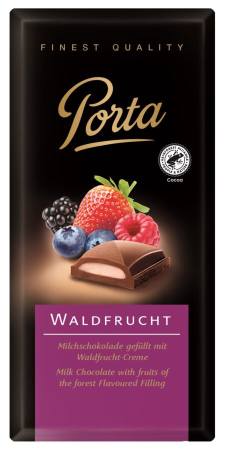 Nicht nur verbotene Früchte schmecken süß. Wie das gehen kann, zeigt unsere Schokolade Porta Waldfrucht. Die knackige Milchschokolade mit aromatischer flüssiger Waldfrucht Creme Füllung vereint zarten Schmelz mit fruchtig-süßen Geschmacksnuancen. Einfach zum dahinschmelzen!