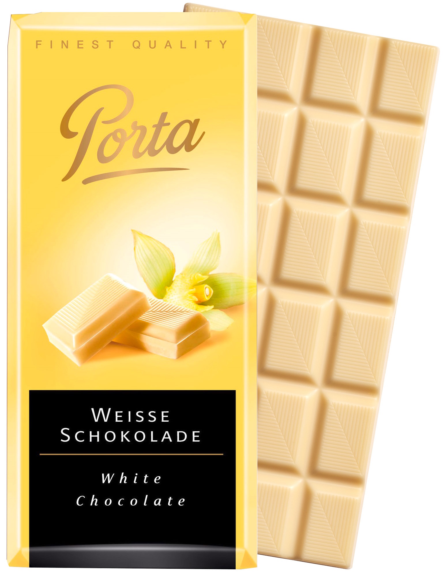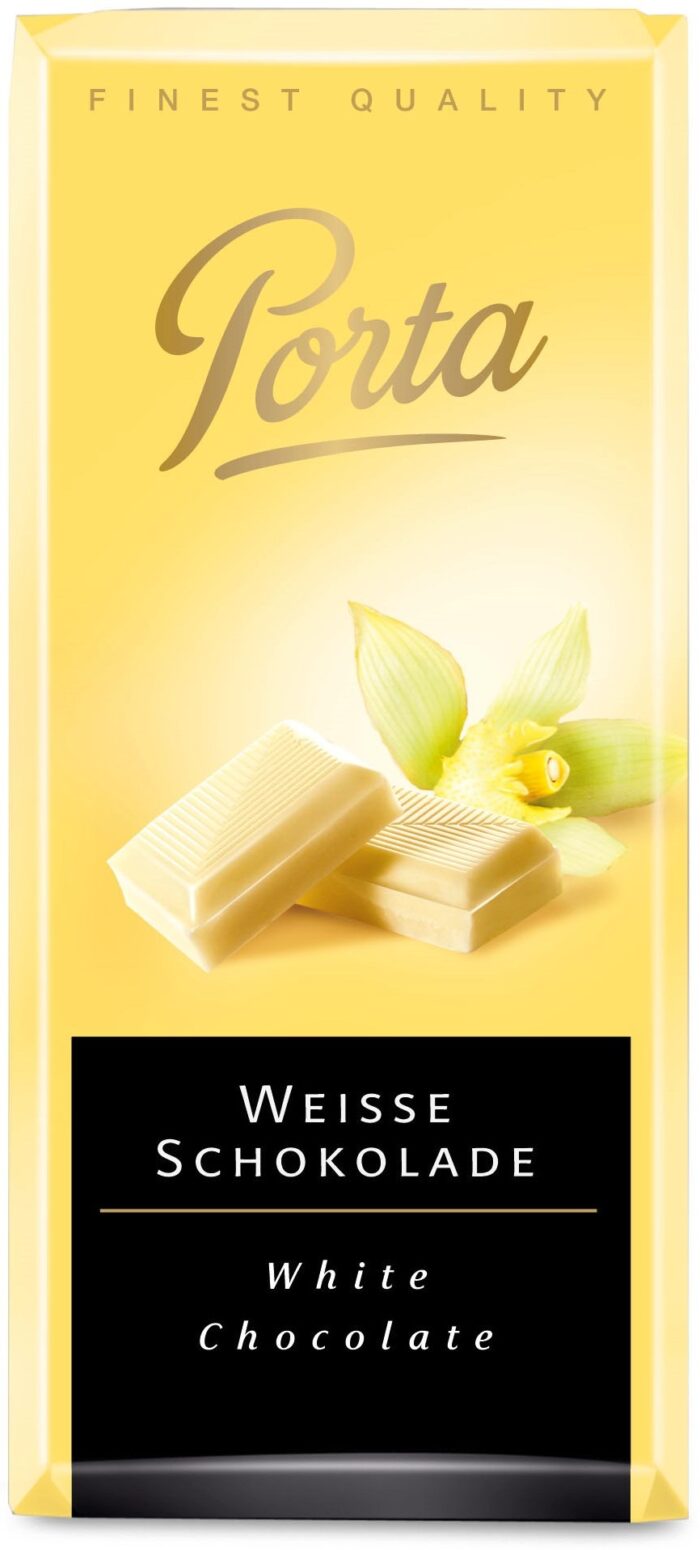 Die Porta Weiße ist die blonde Verführung unter unseren Schokoladen. Die cremige Kreation lässt jede*n Feinschmecker*in verrückt nach weißer Schokolade werden.