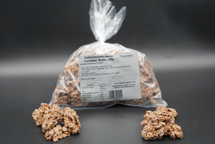 Unsere beliebten 500 g Beutel sind jetzt in unserem Online-Shop erhältlich. Lassen Sie sich von diesem einzigartigen Geschmack verzaubern und genießen Sie gemeinsame Momente mit Freunde und Familie! Knusprige Cornflakes, umhüllt von Vollmilchschokolade, ergeben eine wunderbare Geschmacksbalance.