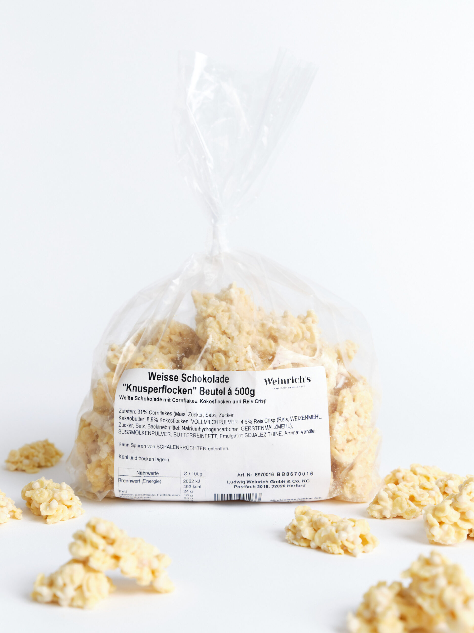 Die allseits beliebten 500g Beutel sind hier im Onlineshop erhältlich. Knusperflocken treffen auf cremige weiße Schokolade und sorgen für einen einzigartigen Geschmack. Teile sie mit deinen Freunden und deiner Familie, um gemeinsam ein unvergessliches Geschmackserlebnis zu erleben.